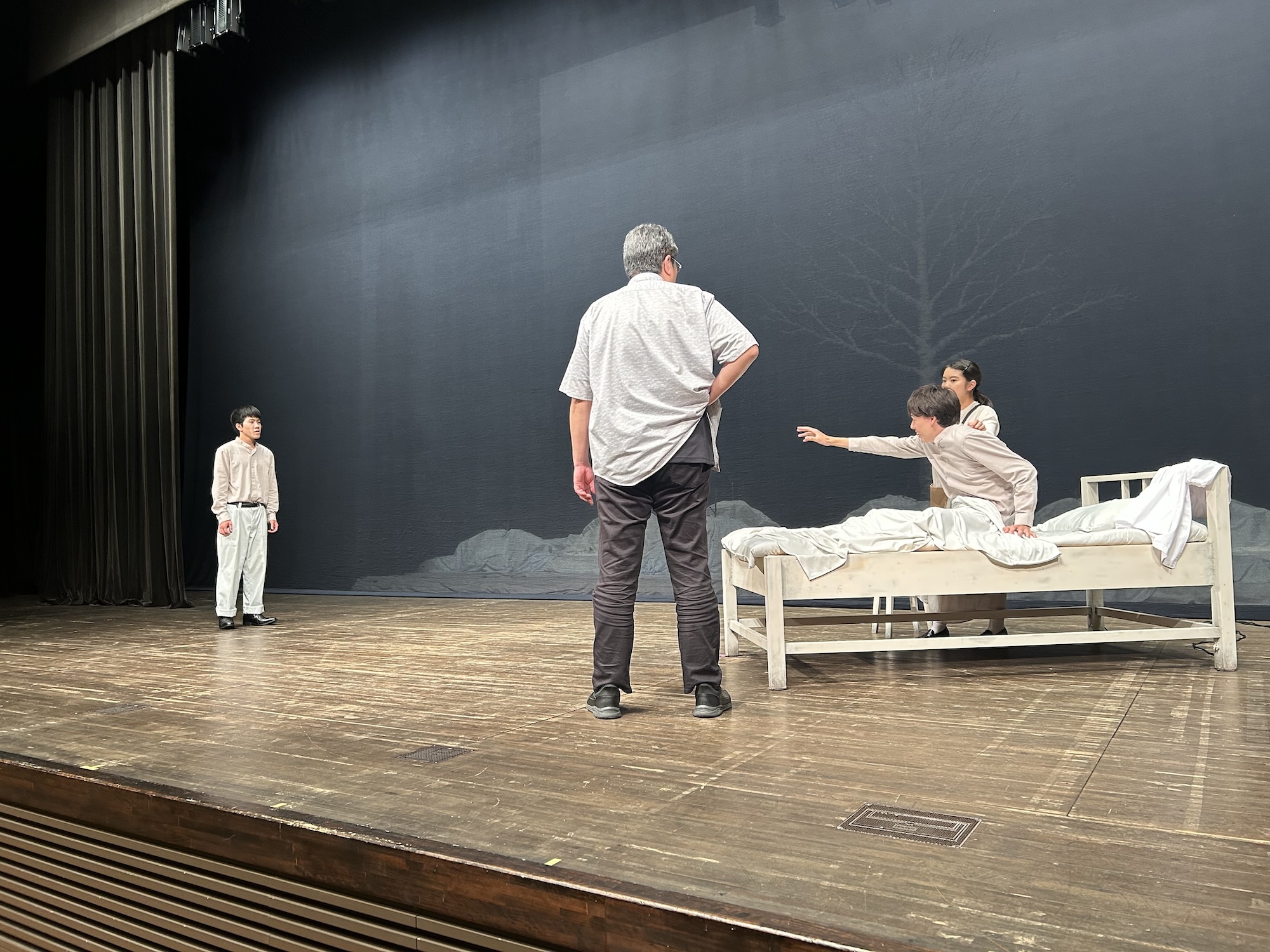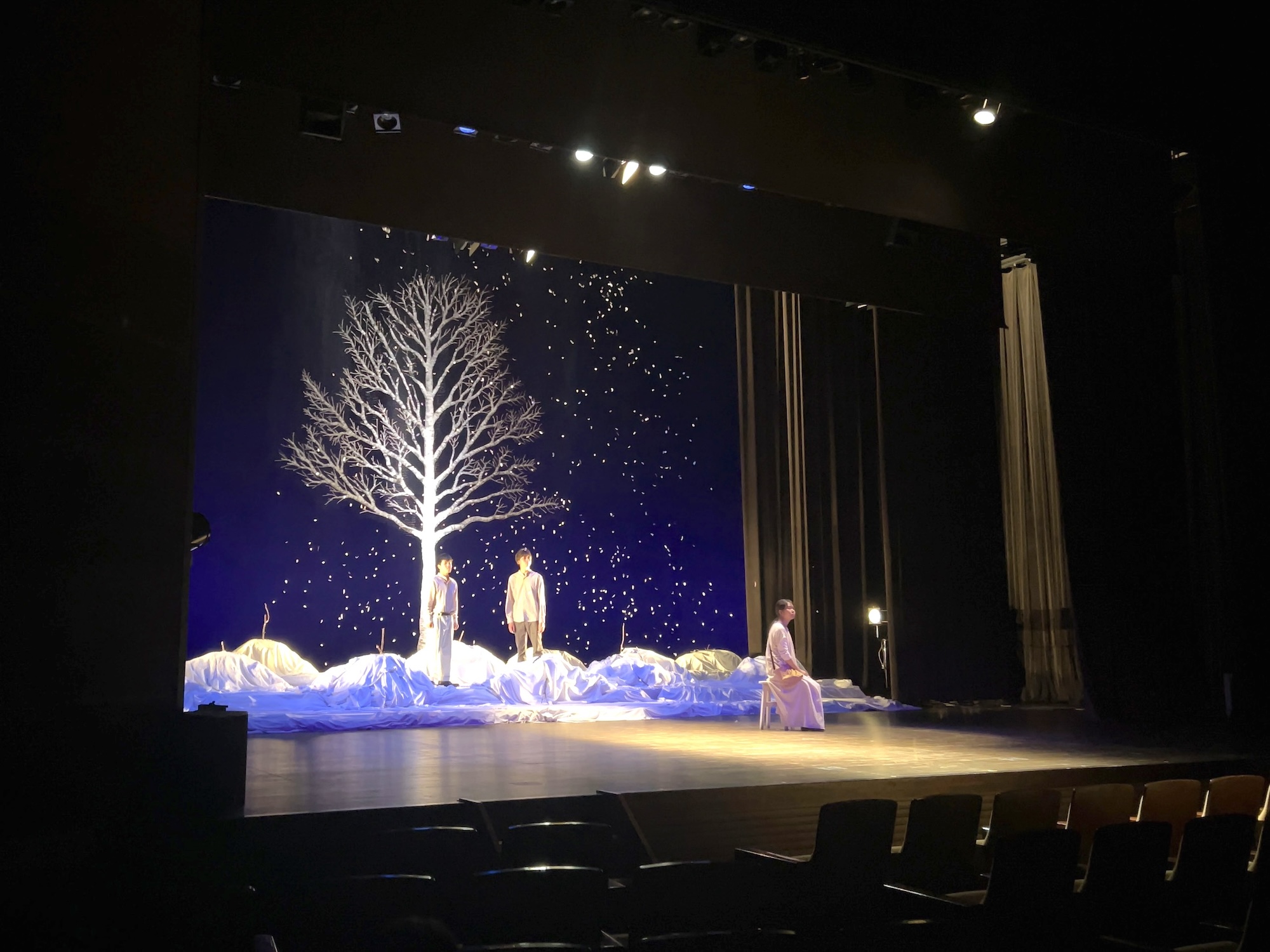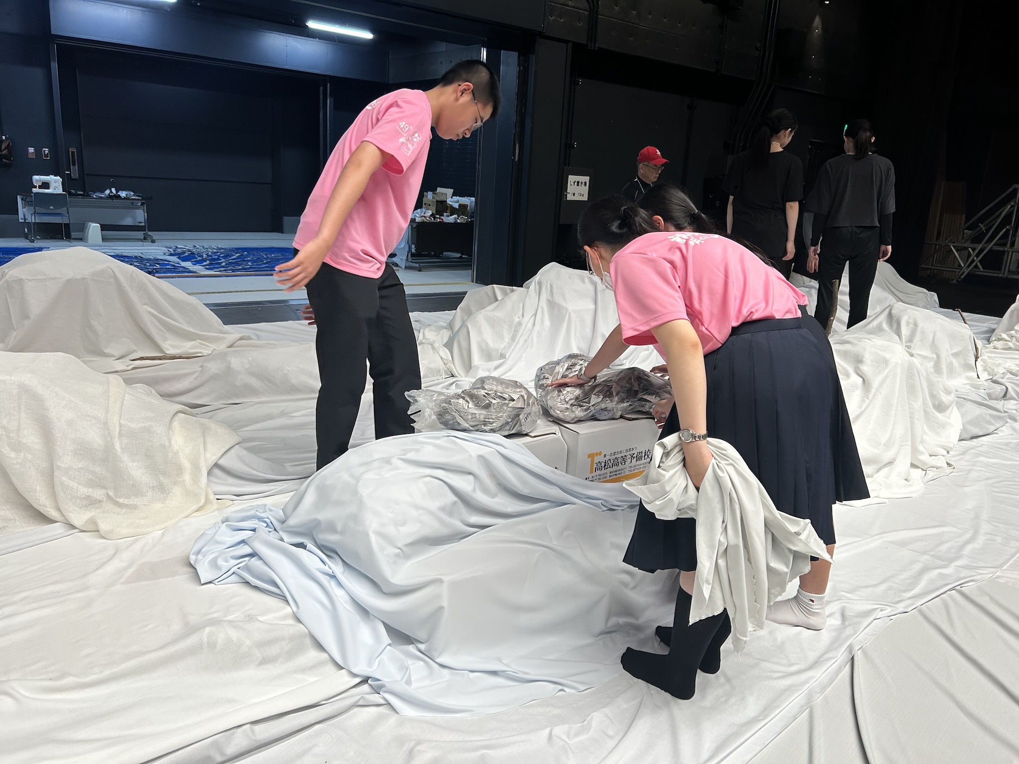 当協会から土屋茂昭氏と土岐研一氏が技術講習会の講師として、座談会には審査員を務める長田佳代子氏も参加しました。1日目は基本舞台を設定した後、土岐氏の指導のもとに舞台奥の雪原と「土饅頭」を白布、段ボール、新聞紙を使って作り、その他に舞台監督の吉木氏と共に雪布の製作をしました。