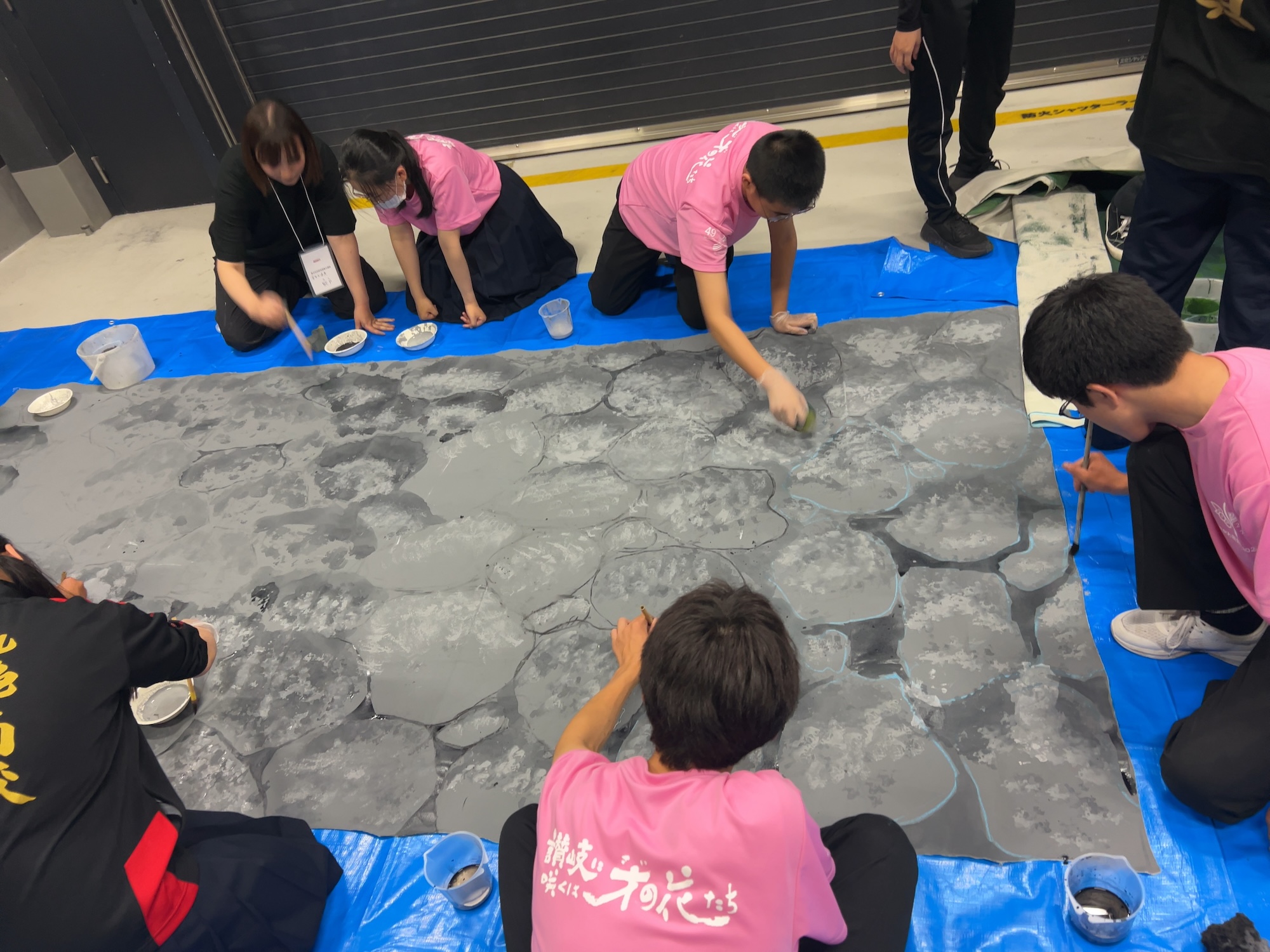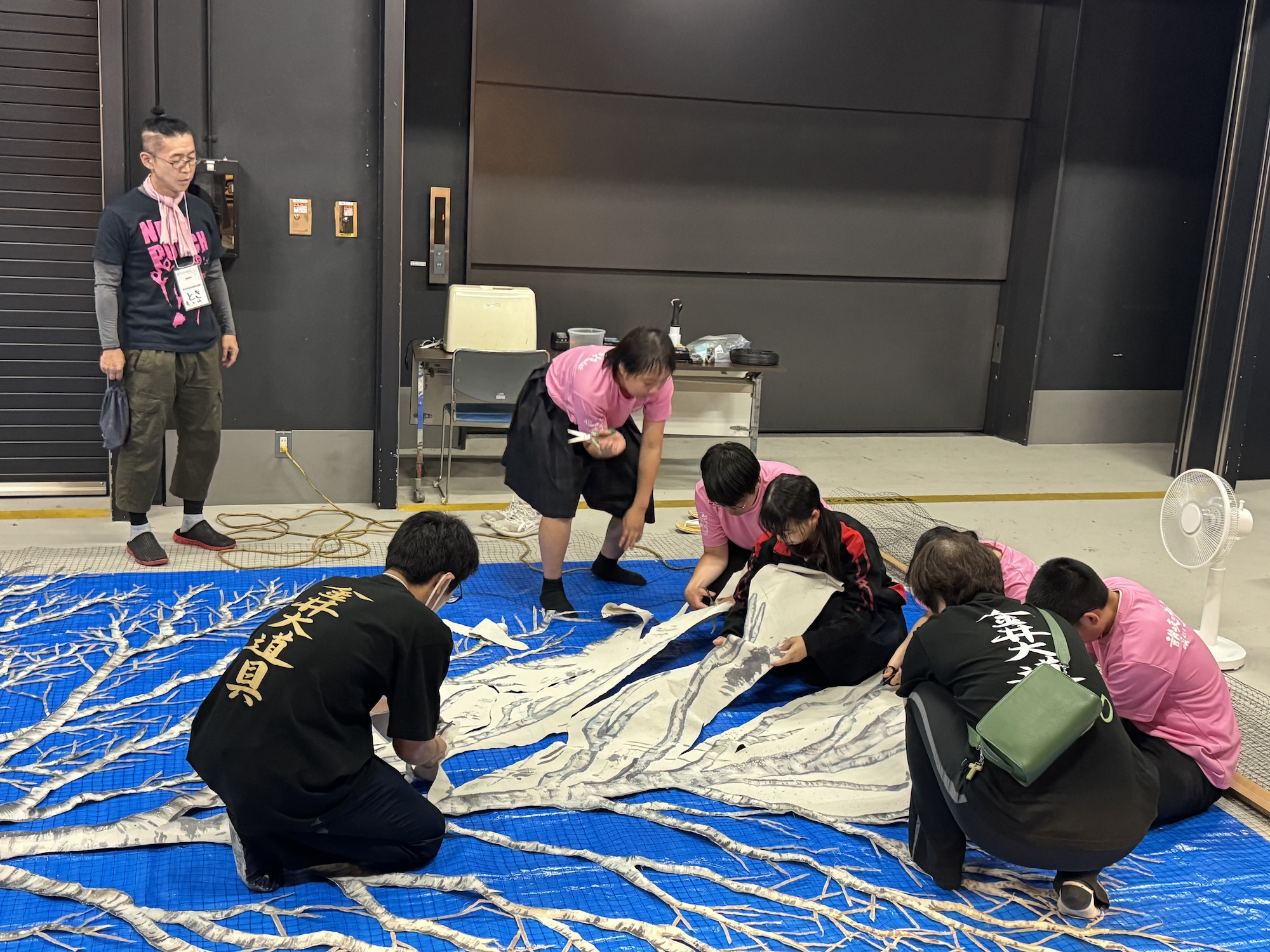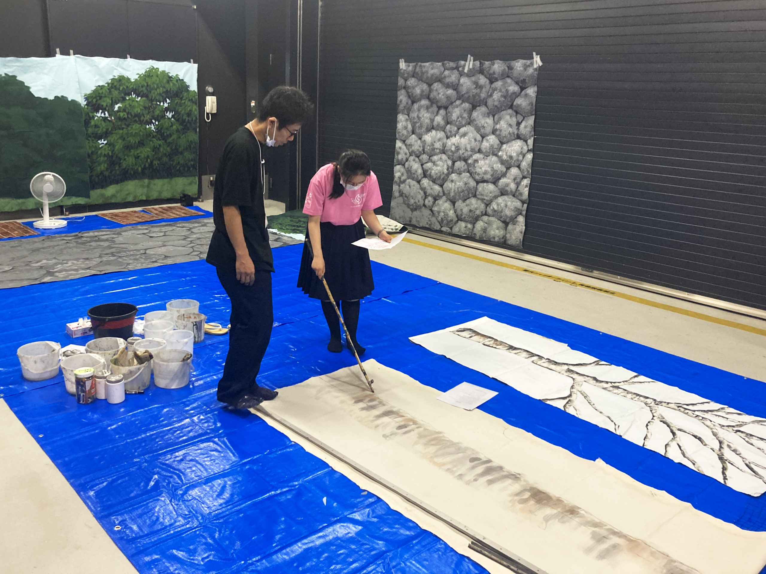 2日目の背景講習には金井大道具から協会員の中村知子氏が進行役として参加。背景の山本・谷口・能戸氏の3名が様々なテクスチャーを背景の技術を披露して描き上げ、学生達にその絵を模倣をしてもらいました。そして、メインの白樺の未完成の部分を高校生達と共に仕上げました。